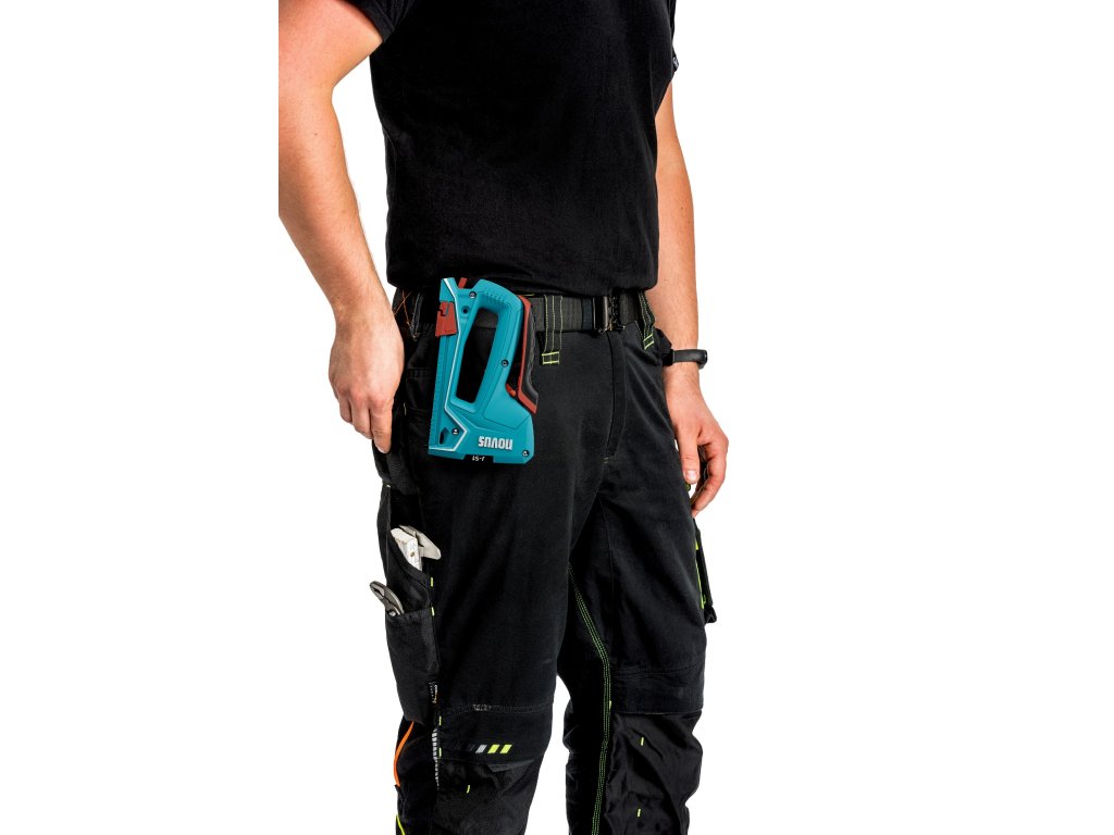 Kvalitní háček na opasek pro snadný transport po pracovišti. Háček je oboustranný. Sponkovačka je vždy při ruce.
