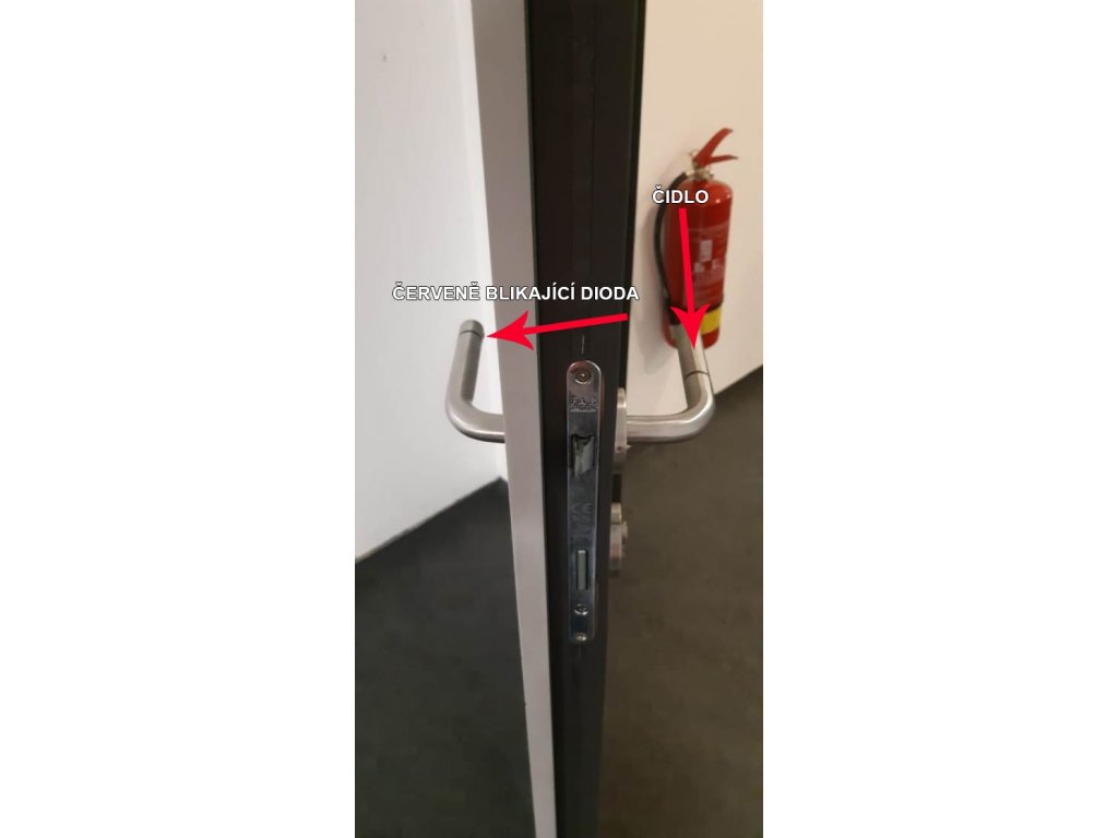 Bezpečnostná blikajúca kľučka pre signalizáciu priechodu dverami. Vďaka tejto kľučke vidíte, že osoba za dverami otvorí dvere na vás - na stranu, kam sa otvárajú. Na strane, kam sa dvere otvárajú je blikajúca dióda, na druhej strane je senzor, ktorý pri položení ruky na kľučku rozbliká kľučku na druhej strane.